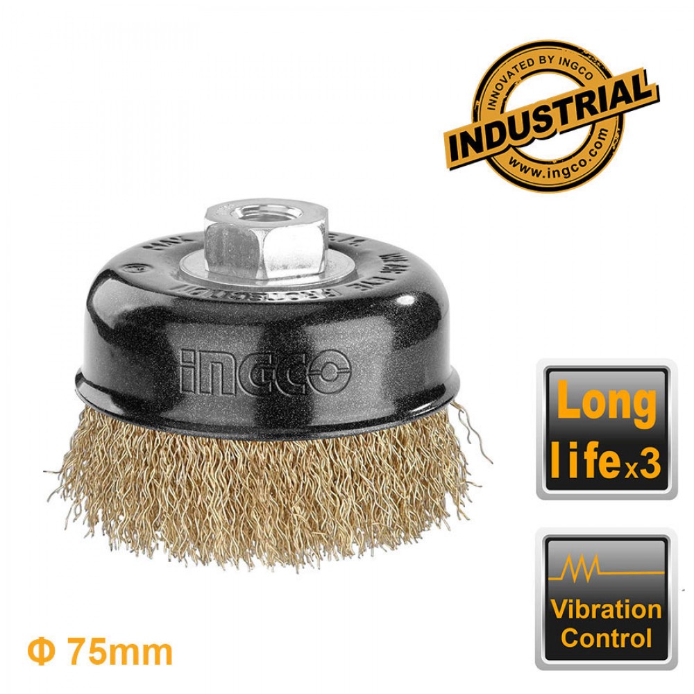 Συρματόβουρτσα κοτσίδα βαρέως τύπου 75 mm καμπάνα γωνιακού τροχού της εταιρείας Ingco. Χαρακτηρίστηκα Ατσάλινο σύρμα Διάμετρος 75mm Πάχος σύρματος 0.3mm Άξονας M14